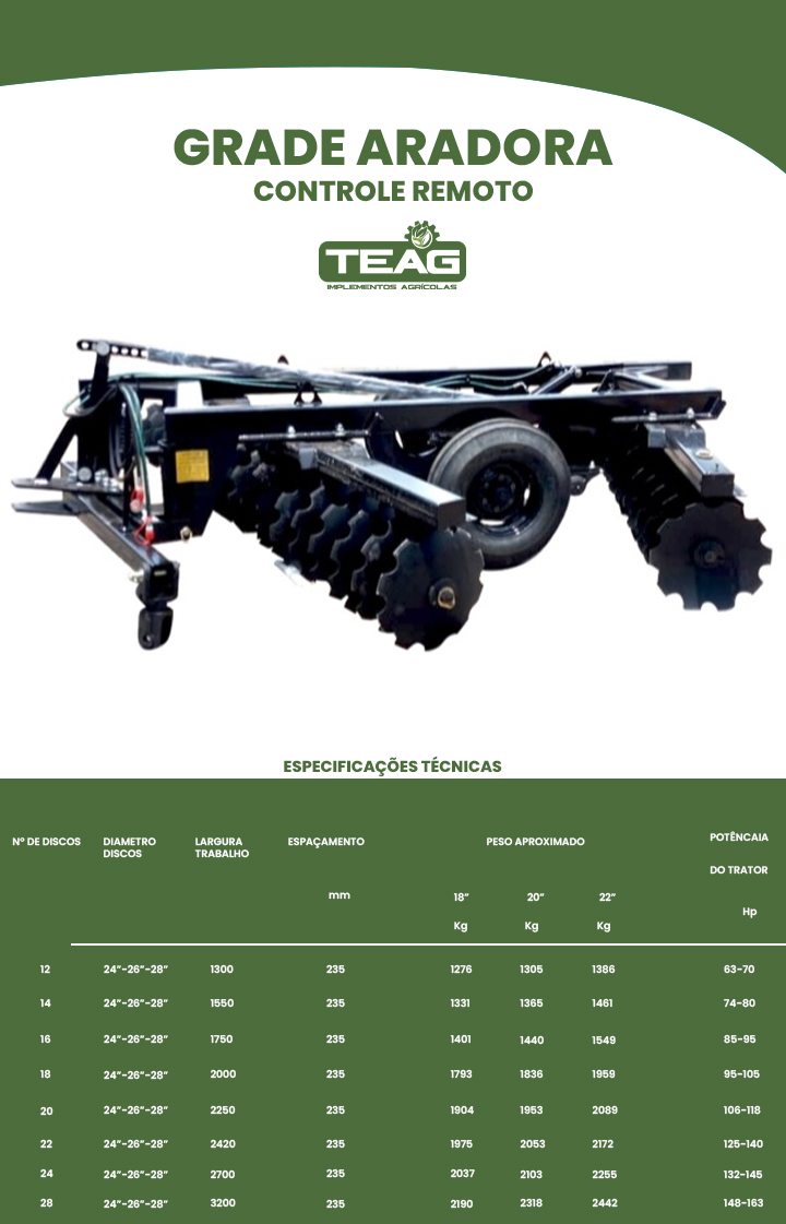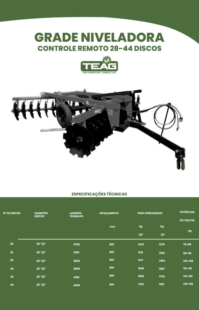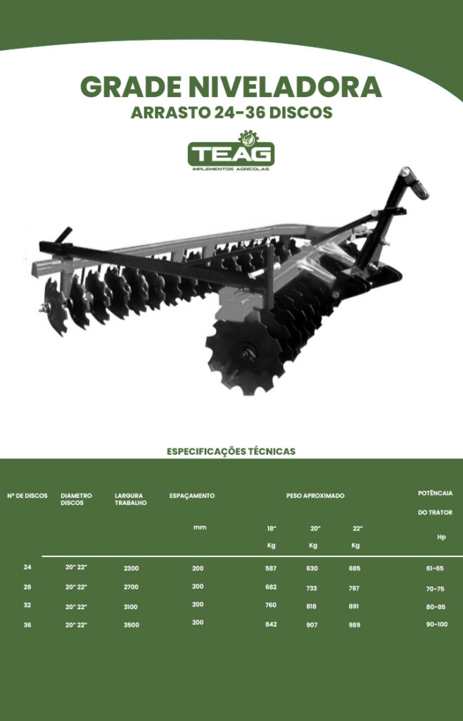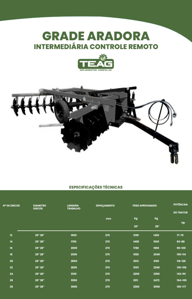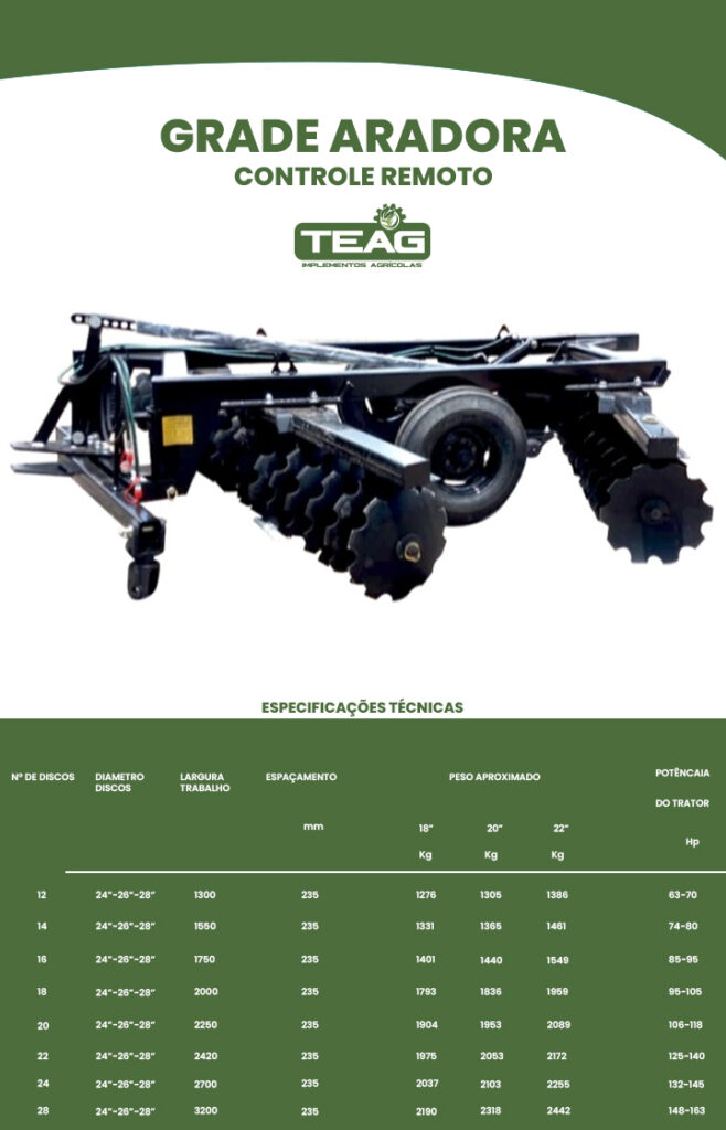 A TEAG é uma empresa especializada na produção de implementos agrícolas de alta qualidade, com foco em atender às necessidades do campo. Fabricamos uma linha completa de equipamentos, como grade aradora entre outros, para oferecer soluções eficientes e inovadoras aos nossos clientes.